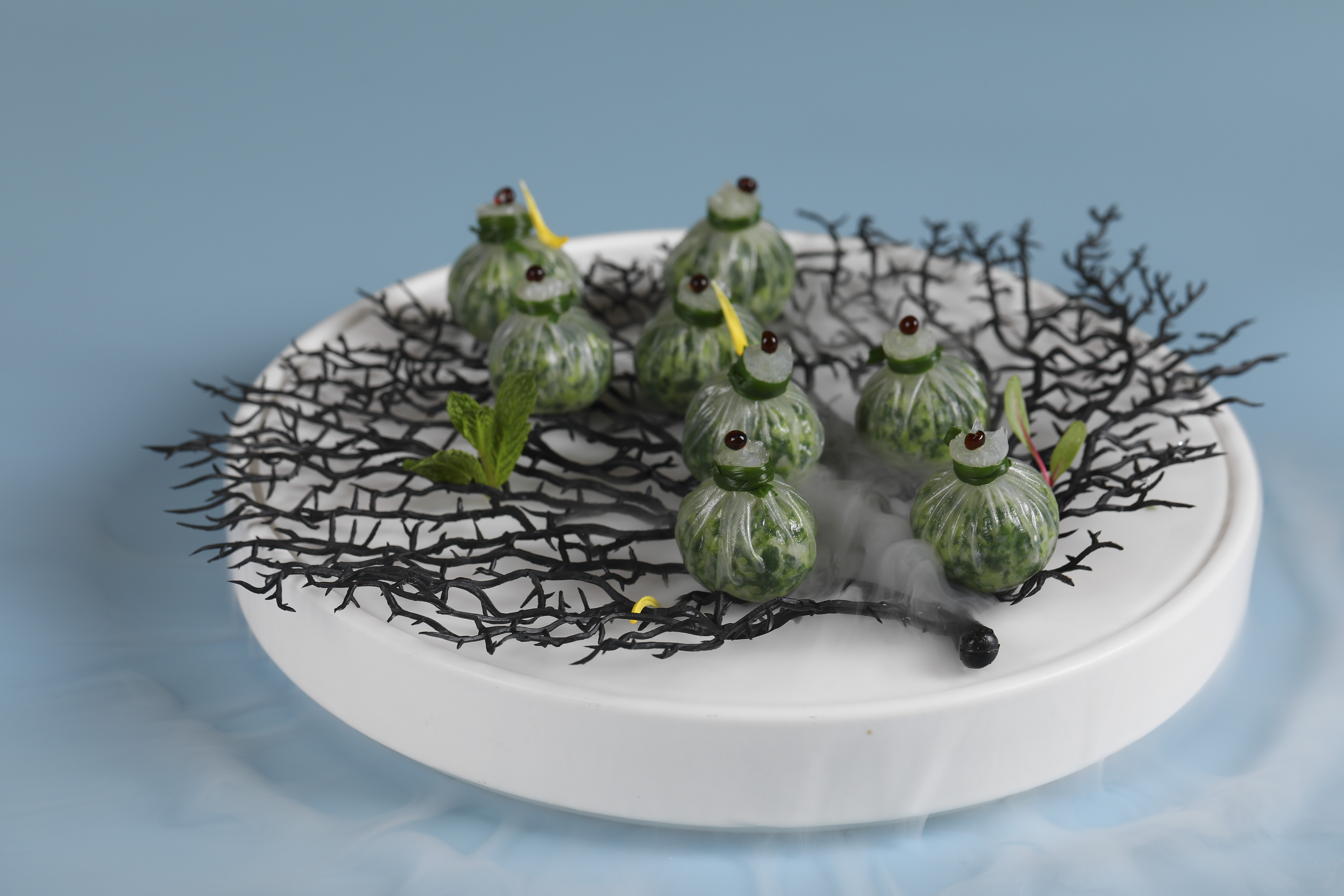 将春季的花蕾或是柔嫩的春芽入馔,搭配美味的食材,清新的味道令人心悦神怡。北京瑞吉酒店天宝阁以茉莉花入馔,茉莉花香葱霸王鸡香味清爽,鸡肉鲜嫩,气韵清雅。成都蒲江花样年福朋喜来登度假酒店聚味中餐厅的水晶绿茶时蔬冻多彩透亮,入口即化,清香的绿茶配上鲜椒汁,多重口感在味蕾绽放。