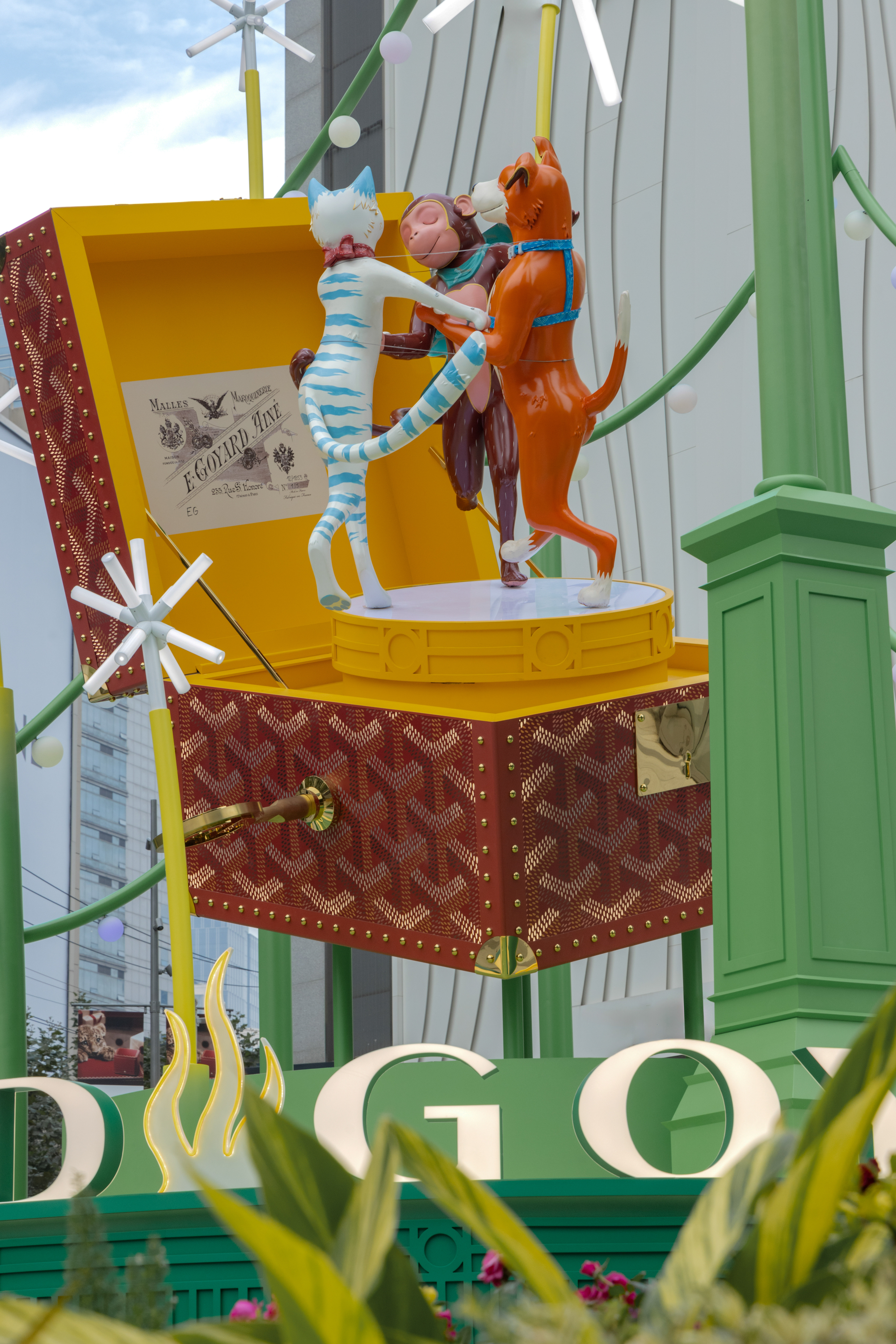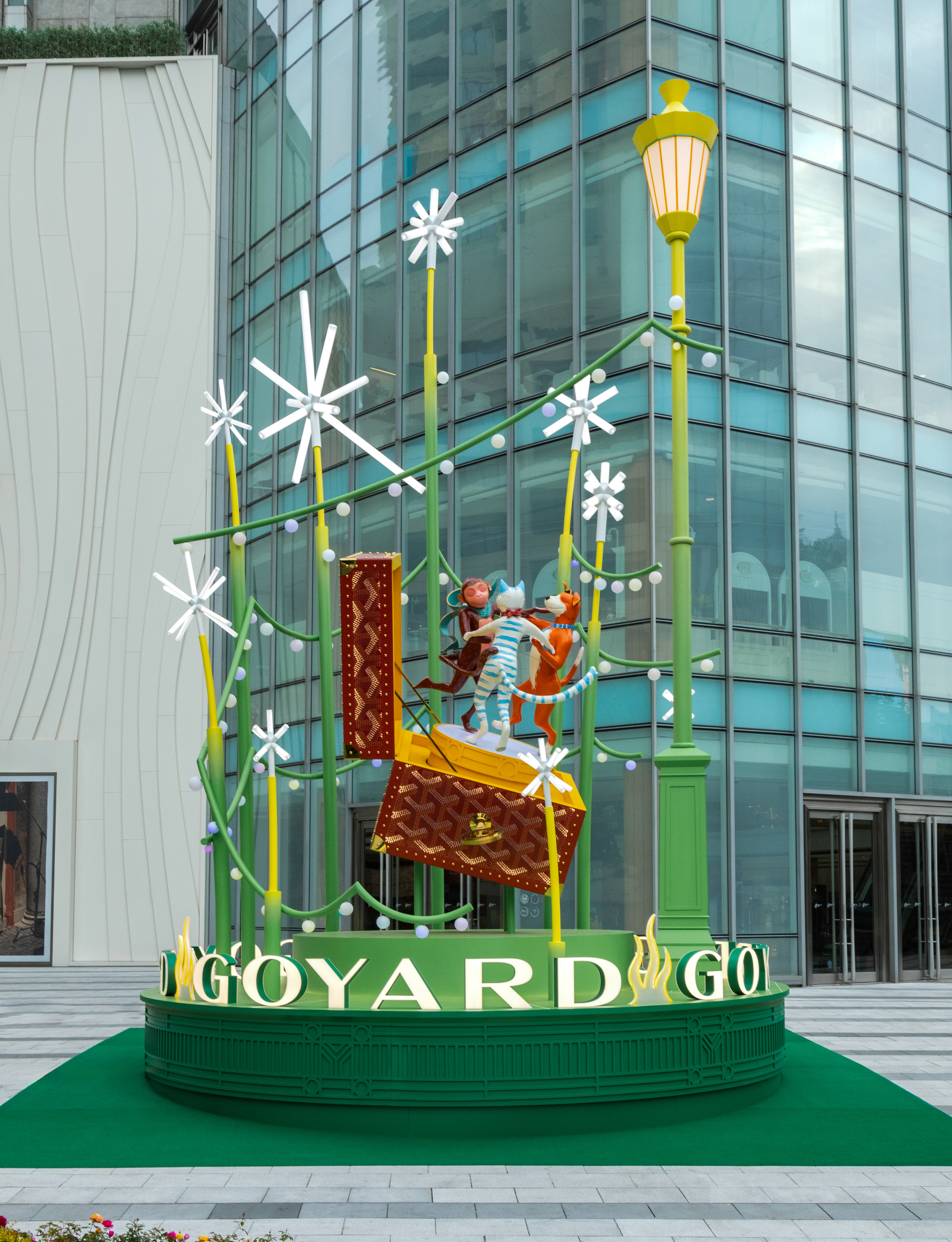 在节日氛围与梦幻布景下,蕴藏着象征性的语言,诉说着GOYARD之家的精神与根源:音乐旅行箱致敬品牌传承的精湛制箱工艺,欢舞的宠物三重奏则呼应经典的“爱犬时尚(CHIC DU CHIEN)”系列。典型的巴黎风格街灯、装饰灯串与花环,交织出“光之城”巴黎的影像——那里,正是GOYARD的故乡。此番奇景,于精品店外,静候您的探索与赏鉴。GOYARDINE霓虹与光影奇境