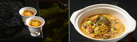 神农架菌汤牡丹豆腐,这道佳品的灵感,源自国宴名馔“开水白菜”的烹汤哲学,甄选孝感散养逾两年的土鸡,以清冽山泉慢火蒸制十二小时,汤色清亮如茶,底蕴醇厚悠长。红安永家河泉水内酯豆腐,质地莹润,毫无杂孔,因富含天然矿物质,无需石膏点制,独留纯粹豆香。将其精雕为牡丹花形,形态雅致,白净如玉。再配以神农架野生羊肚菌、松茸等山珍,同蒸八分钟。菌香渗入汤中,鲜味层层舒展,终成一道汤清、形雅、味醇的“国色天香”之味。
