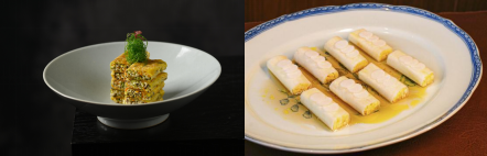 油醋咸宁甜笋卷,一品山水,满口清鲜。咸宁的灵秀山水,孕育出这道风雅之味。本地黄节瓜敦实脆嫩,自带清甜;山林甜笋,鲜嫩饱满,蕴藏着自然的野趣。以甜笋为衣,包裹节瓜细丝,切段成卷。再以咸宁板栗精心制成的栗茸点缀,平添一抹温润香甜。极鲜味汁与清冽白醋交融,勾勒出酸甜平衡的清爽风味。