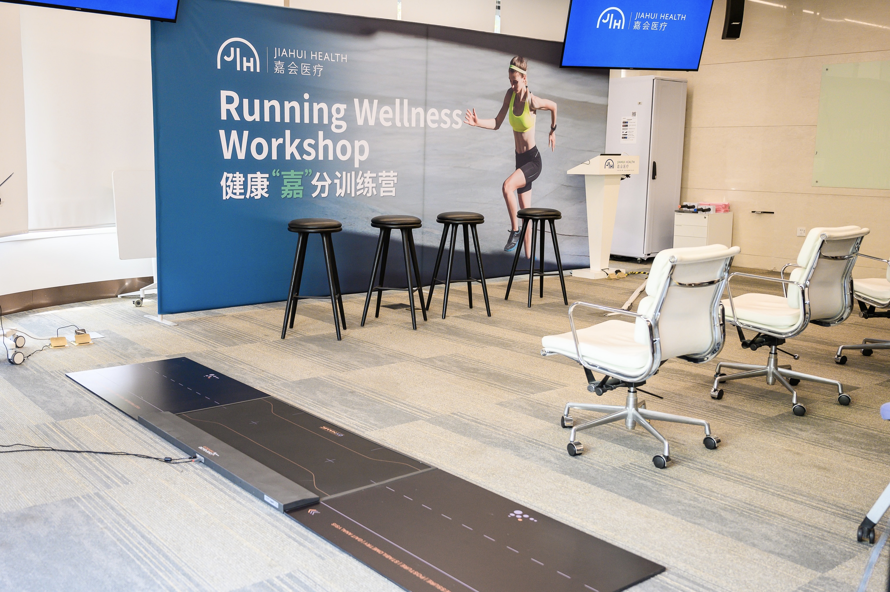 上海嘉会国际医院内设有马拉松季健康主题展示区域,营造健康活力的浓厚氛围