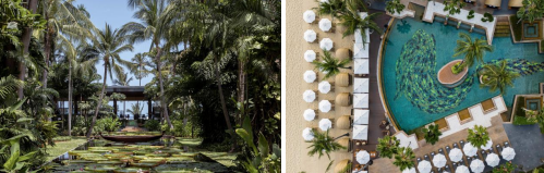 从左至右:苏梅岛波普安纳塔拉度假酒店莲花池一景;酒店泳池鸟瞰图。