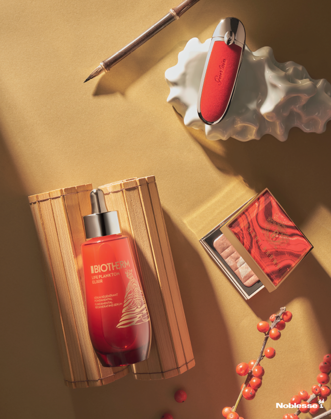 左起顺时针方向:Lancôme全新精华肌底液(2022年新春限定);Dior烈艳蓝金唇膏#999丝绒、烈艳蓝金唇膏套装(花漾新年限量版);Fresh红茶紧致塑颜精华露(MOLLY萌虎版)