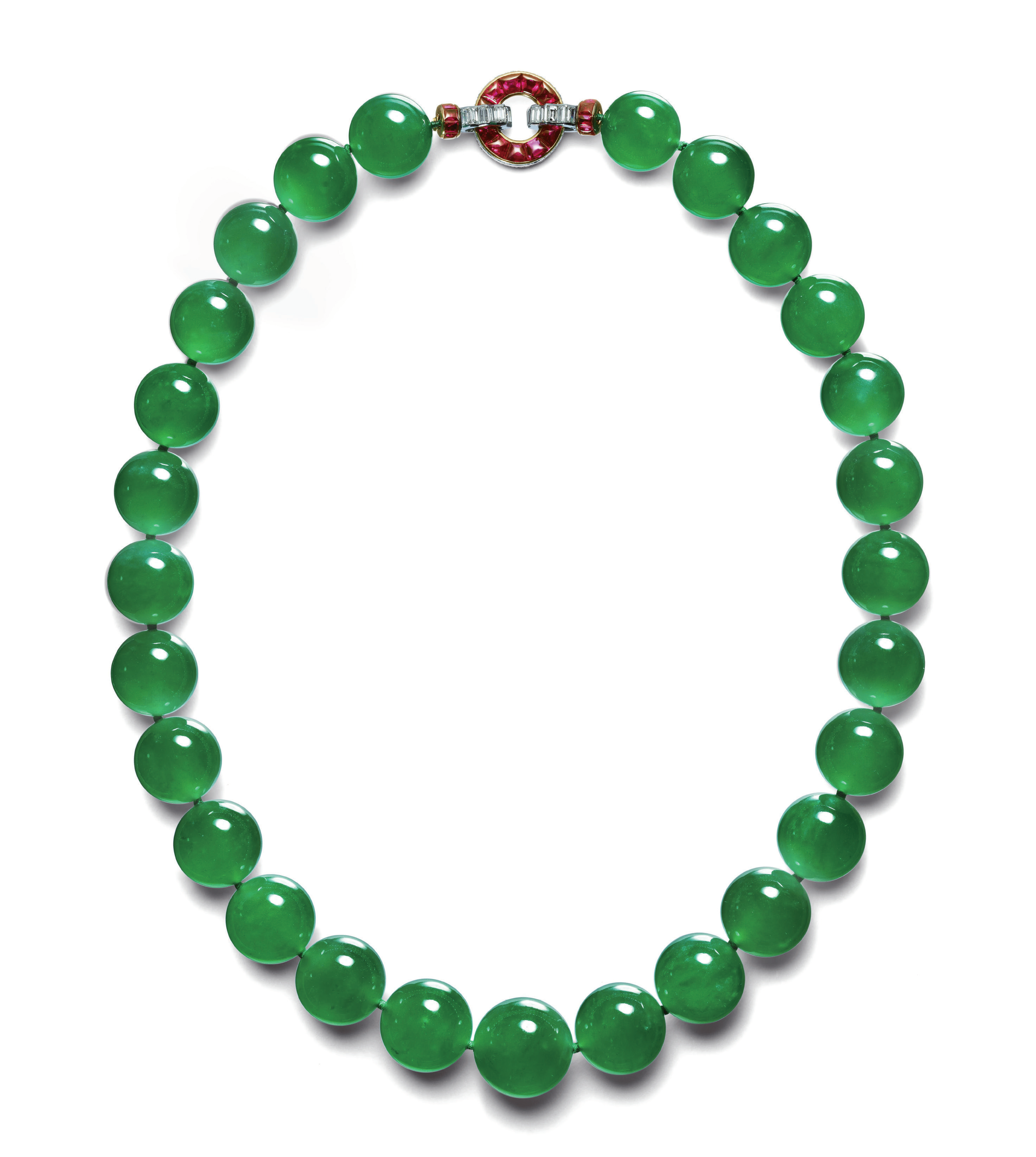 这件被誉为拍卖史上最昂贵的翡翠首饰,由27颗天然翡翠珠子组成,长度约53厘米,是名媛芭芭拉·赫顿(Barbara Hutton)的父亲于1932年特别为她在卡地亚定制的结婚礼物。这条项链的翡翠珠直径约15.4-19.2毫米,据推测原件应该来自晚清宫廷,而且其中的翡翠珠粒或许多出一倍有余。原件于20世纪初流到欧洲,后被按照当地习俗重新组合串珠,最终落入卡地亚之手时仅剩27颗,依然不妨碍它成就翡翠的传奇。
