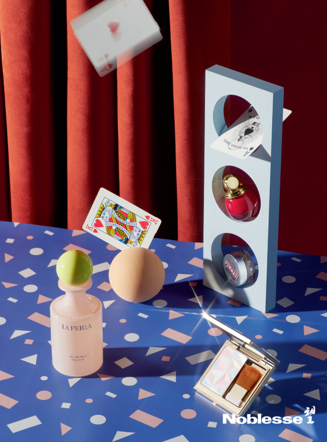 左起顺时针方向:La Perla高级定制香水(隐匿至怀);Dior金艳幻彩甲油#862;Benefit by Sephora无色不作持色眉膏#3;Clé de Peau Beauté亮采柔肤粉#103(森野寻踪限定版)