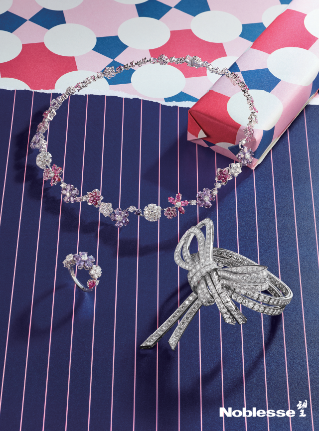从左至右:Folie des Prés系列白K金,粉红色及淡紫色蓝宝石,钻石项链及戒指,Noeud白K金钻石手镯(Van Cleef & Arpels)