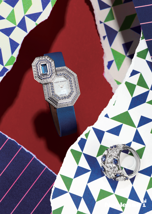 从左至右:Emerald Signature高级珠宝系列腕表和Secret Cluster高级珠宝系列彩色宝石钻石戒指(Harry Winston)