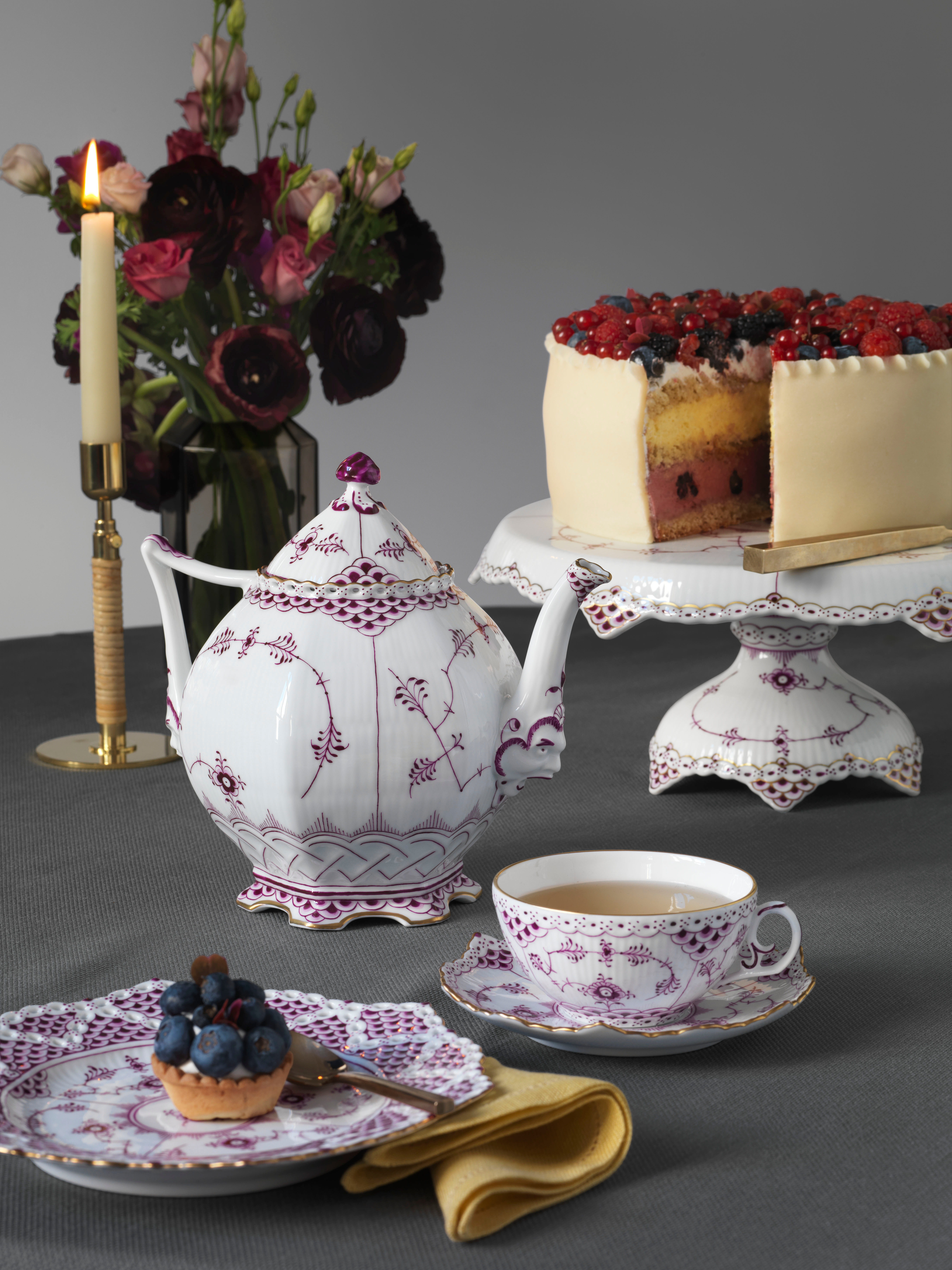 自1775年丹麦皇家瓷器厂成立之初,经典的钴蓝色就作为皇家哥本哈根标志性的颜色,虽然工匠们也一直尝试着用蓝色以外的其他颜色来装饰瓷器作品,但其他颜色的不稳定性与繁琐的高温烧制过程,让工厂耗费了很多精力。直到弗兰茨·亨里奇·米勒创造了紫色,并在19世纪80年代末,皇家哥本哈根推出了紫色全蕾丝唐草系列,其深紫红色唐草花纹被巧妙地通过手工绘制,细腻地装饰在釉面之上。