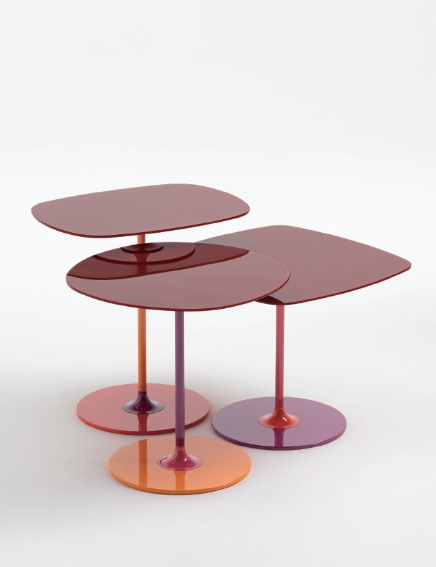 正如印象派画家保罗·塞尚所说:“光是一种无法复制的东西,必须用其他东西来表现——通过颜色。”2022年,Piero Lissoni为Kartell设计的Thierry休闲桌组以明亮的波尔多红来照亮空间,这些“珠宝”般的桌子配有玻璃台面和金属桌腿,色泽像璀璨的宝石。桌腿和桌面在同一颜色系列中采用对比鲜明的组合。