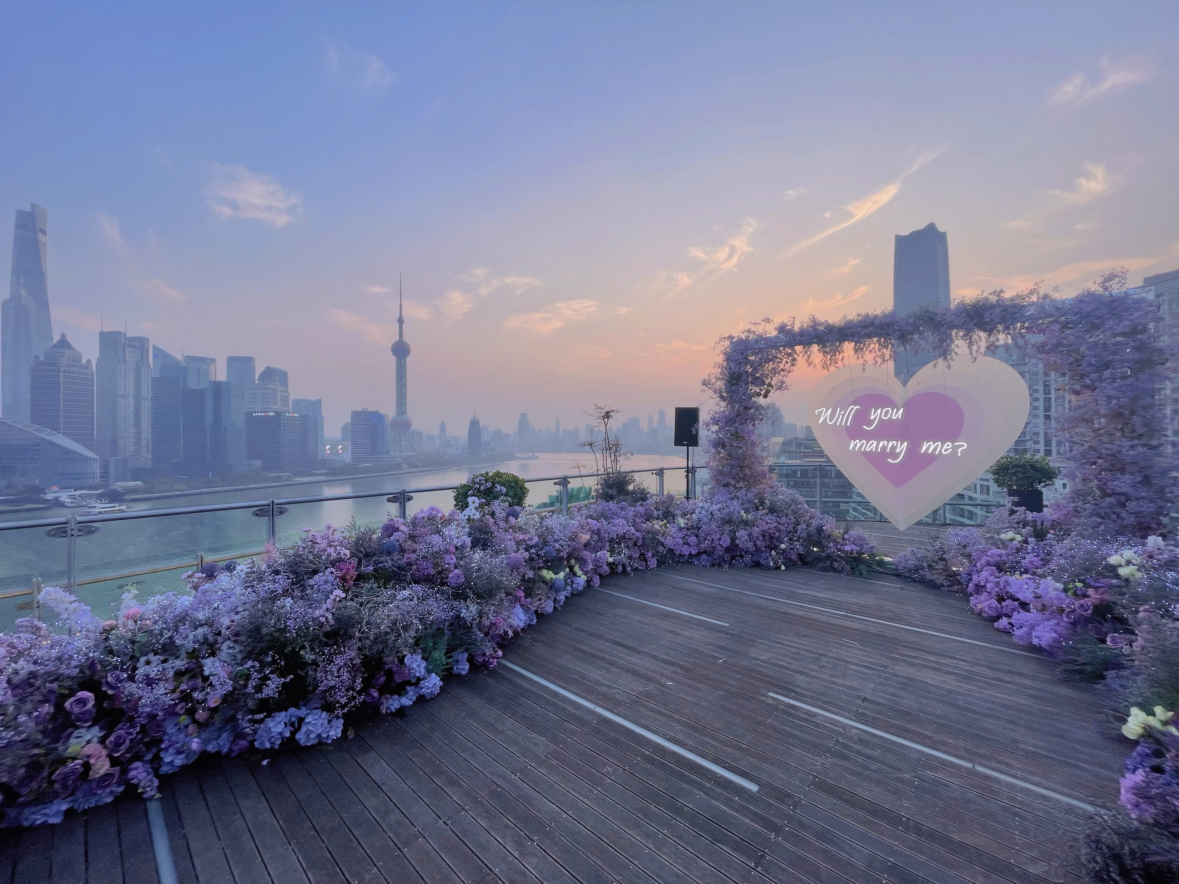 位于酒店顶楼露台婚宴场地,以其无与伦比的城市天际线和黄浦江的波光粼粼为背景,为您的婚宴编织一幅动人的画卷,日月同辉见证幸福的浪漫时刻。