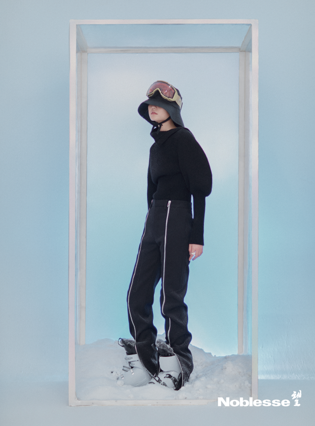 黑色针织上衣、拉链饰黑色长裤、造型戒指(all from Bottega Veneta);黑色宽檐帽(Arket);卡其色滑雪眼镜、双板滑雪鞋(both from Rossignol)