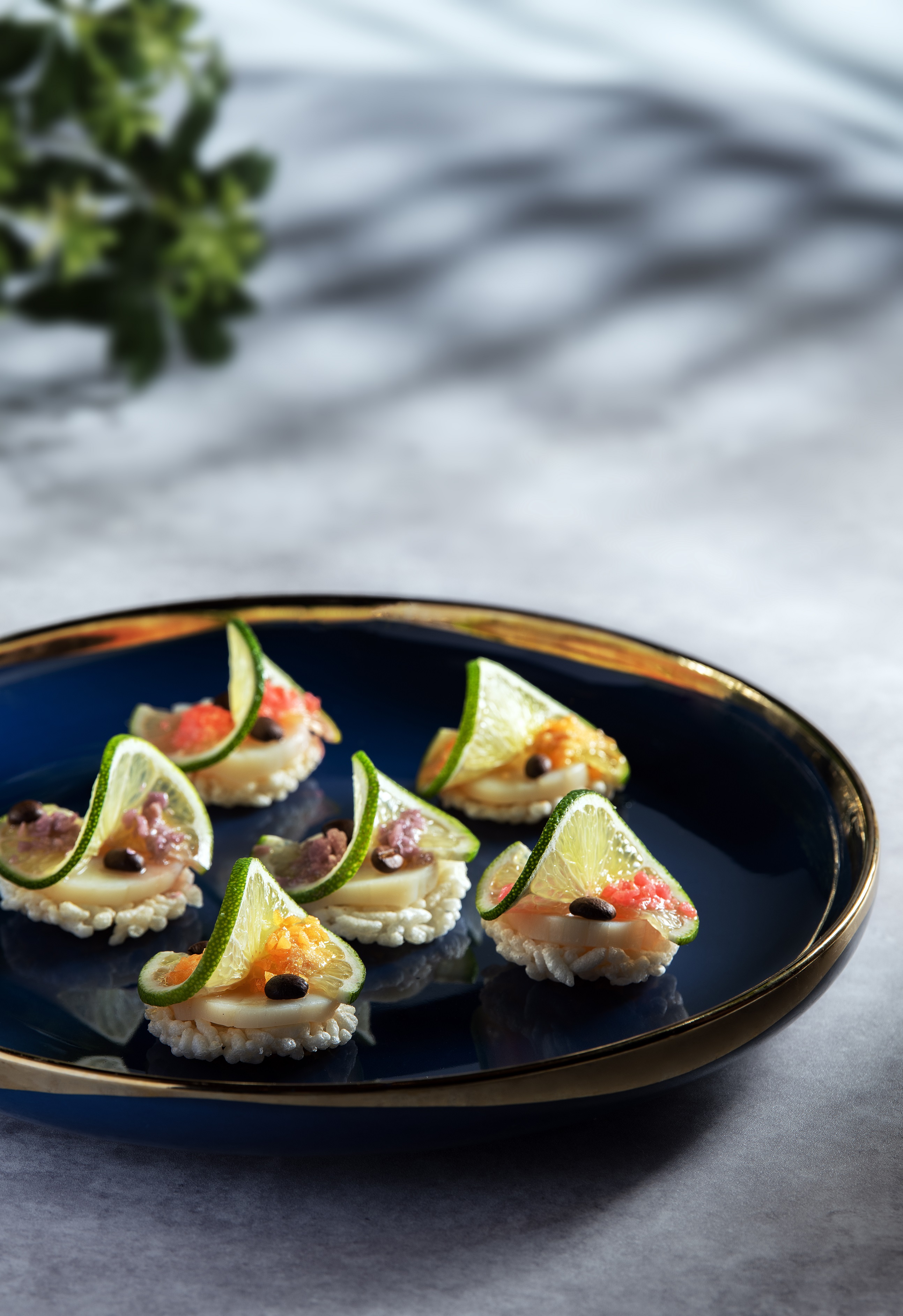 柠檬扎片,精选海南当地无籽香水柠檬,切至清薄透明片状后覆于紧致鲜嫩的片状贝柱和清香米饼之上,再以色彩艳丽的跳跳糖和酥脆的海南兴隆咖啡豆点缀,中和了入口时柠檬带来的强烈酸味。不仅你能品尝到扑面而来香水柠檬的清香风味,又能感受来自兴隆咖啡豆的醇香,清爽开胃。