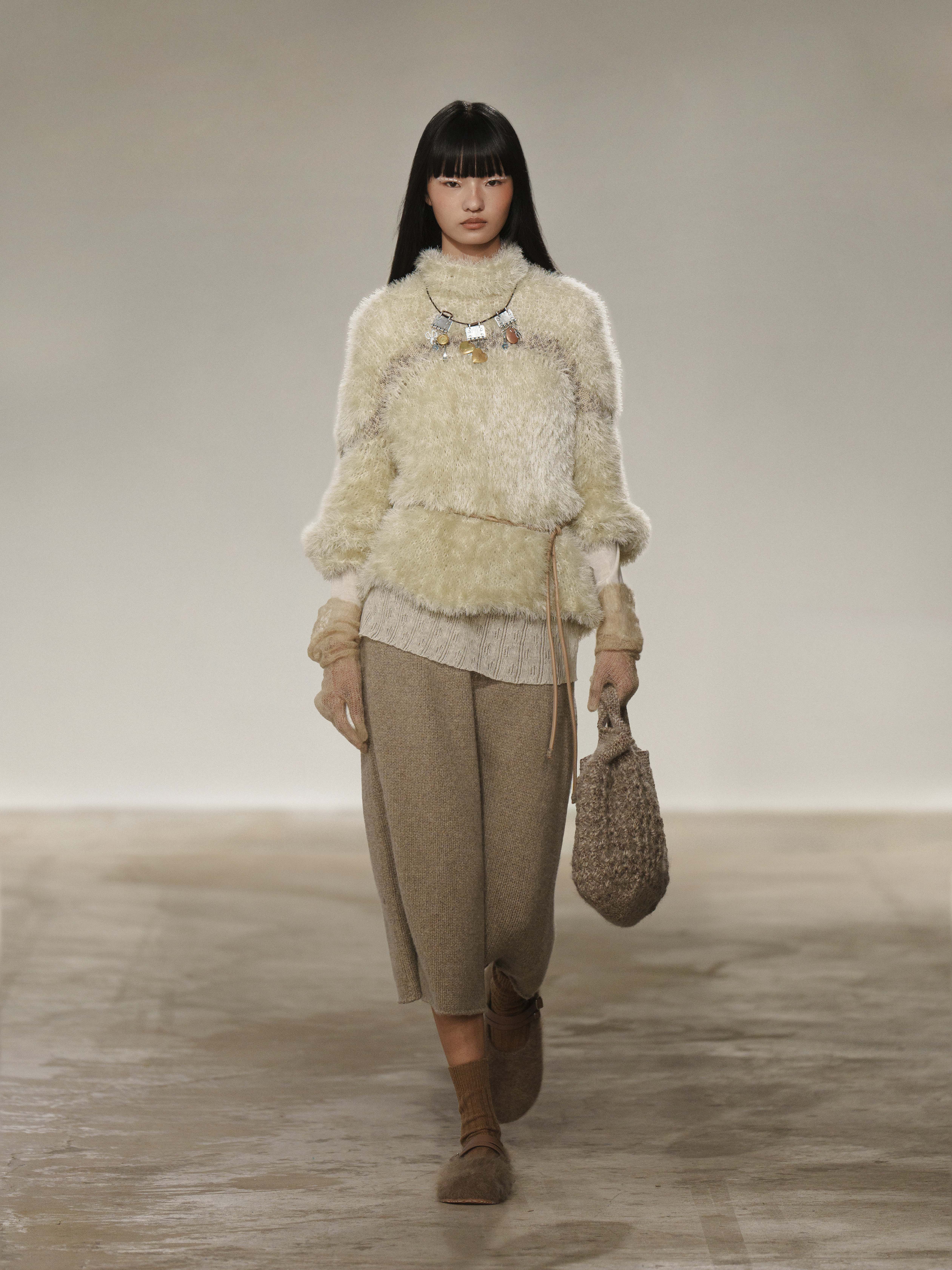 女性之手从自然中驯化植物,将其采摘,揉捻,染色,再由更多的人将其纺织成为纱线。而编织作为一种带有强烈情感投入的动作,既包含了一种穿梭于时间的线索,又在不断重复的编织动作中不断寻找和拉进编织者与家庭以及他者的关系。借由一根纱线,那些精心设计的几何图案和繁复的线条被织入衣服之中,在身体上延展,流动,像是饱含温暖爱意的书信。
