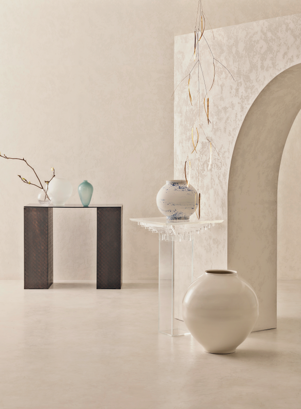 从左起开始:拥有独特肌理的边桌为设计师Park Chan-hoon的作品“连接2021”(Piaz),插着树枝的透明花瓶为艺术家Yoon Tae-seong用吹制法制作的,绿色花瓶出自艺术家Annalisa之手,两款作品均在Gallery Kabinett有售,两者之间的白色花瓶(Soluna Living)。艺术家Kim Ho-jung的“Blue Moon VI”系列陶罐,有如青色染料随意泼洒其上(Hojung Studio),建筑感突出的透明亚克力边桌(Studio Shinyoo),地上细腻的月白色坛子来自艺术家Shin Won-dong。