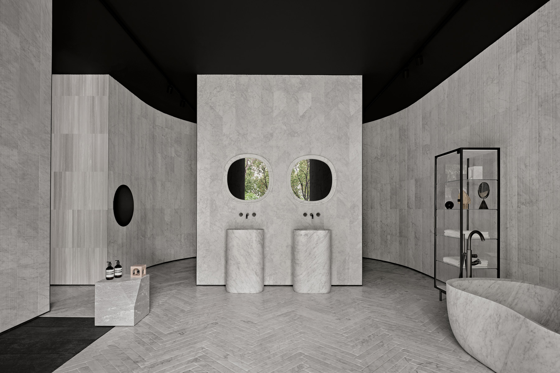 入口大厅的尽头,是一个流动的弧形空间,Elisa Ossino设计的Balnea浴缸和搭配着Spaghetti水龙头的壁挂式浴室柜陈列其中,Bianco Carrara石材打造出的弧形形体充斥着几何感的流畅优雅,从多元的视角刻画着空间与产品的灵动。
